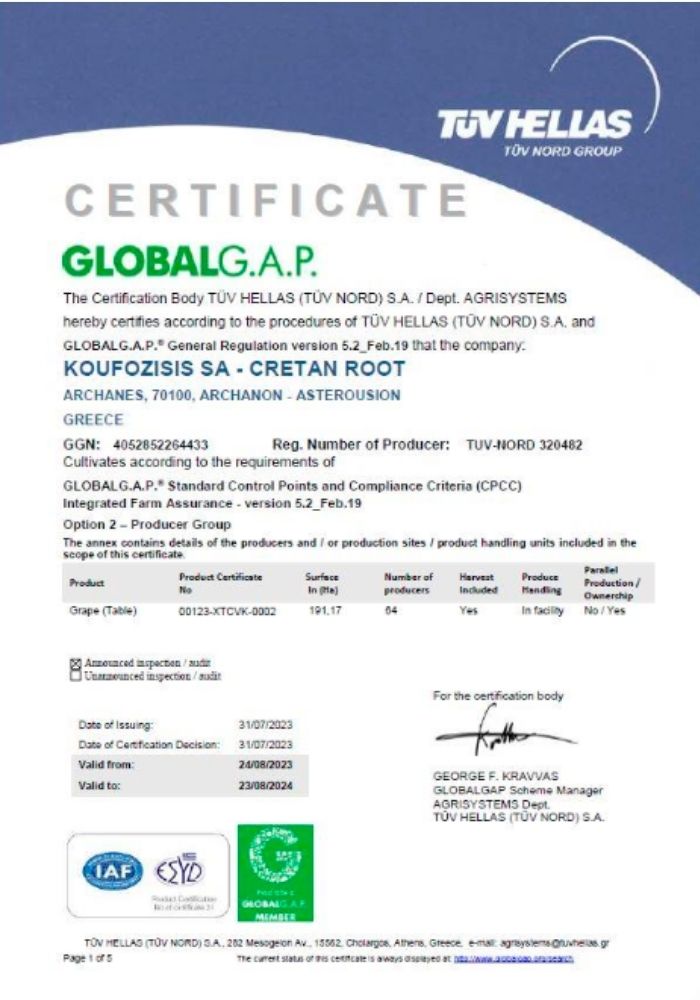 The microclimate which prevails in Archanes and Silamos in combination with the personal care and love involved have as a result grapes of high quality. We mainly cultivate Thompson Seedelss & Crimson Seedless but we have also expanded to other varieties as well.